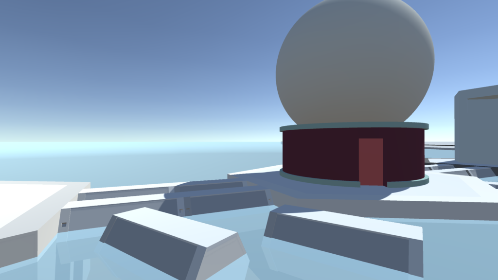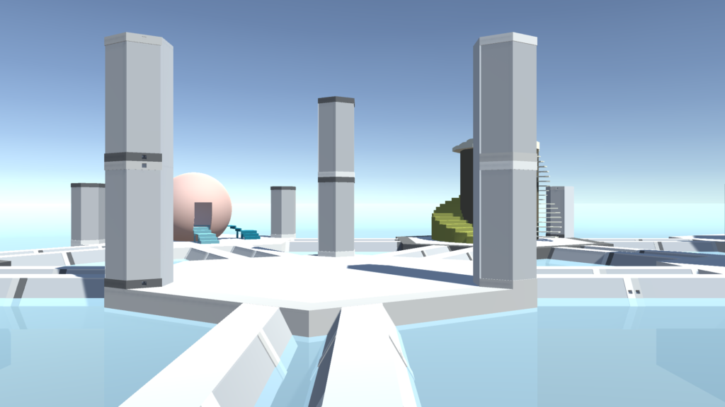 海上都市の未来感を演出するために、フランス革命期の近代建築も参照しながら建物を一つひとつ3Dモデリングした。