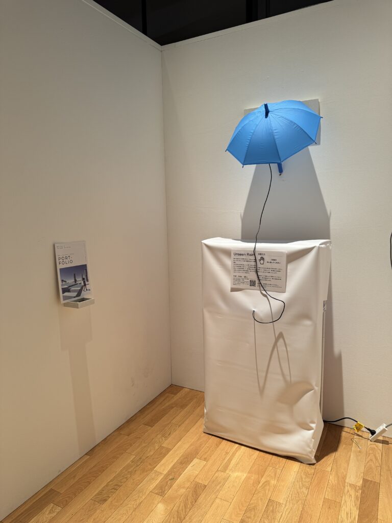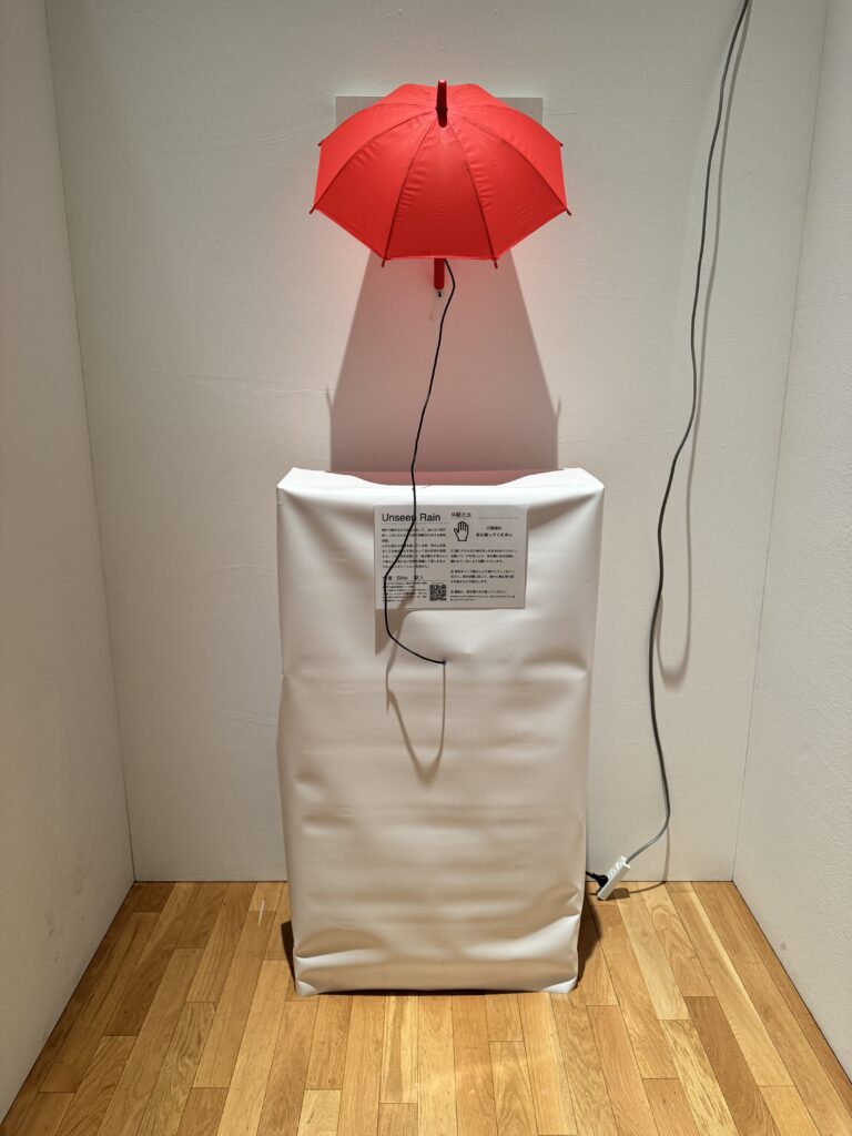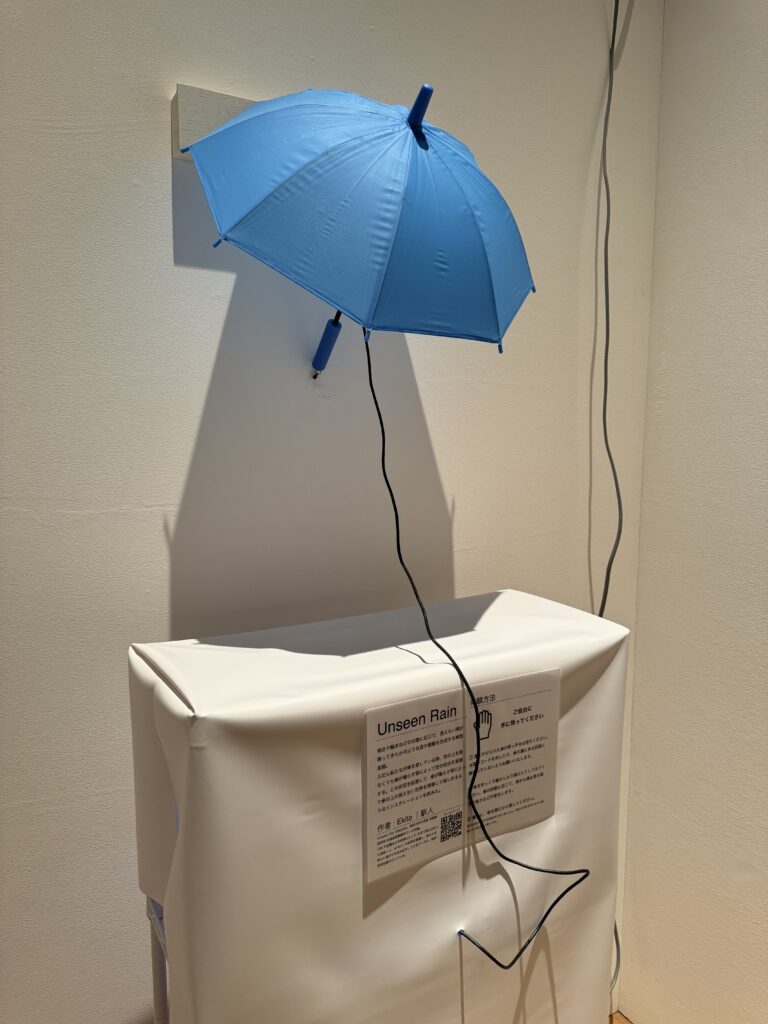 ふだん私たちが傘を差している時、空の上を見なくても傘が鳴らす音によって空の状況を想像する。この状況を拡張して、傘が鳴らす音によって傘の上の見えない世界を想像して楽しめるようなインスタレーションを目指した。